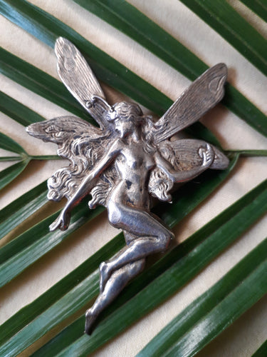 Broche vintage Noor - Elfe. Femme nue ailée. Doré.