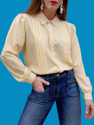 Chemisier vintage Victoire - Jaune pâle. Col brodé. Taille L, 40, 42. Made in France.