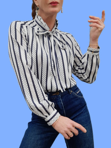 Chemisier vintage Félicie - Pois & rayures. Bleu marine et blanc. Taille M, 38, 40.