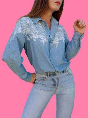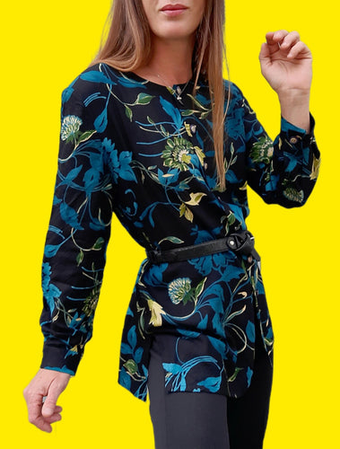 Chemise vintage Séverine - Imprimé floral bleu pétrole. Taille M, 38, 40. Créaline de Daxon.