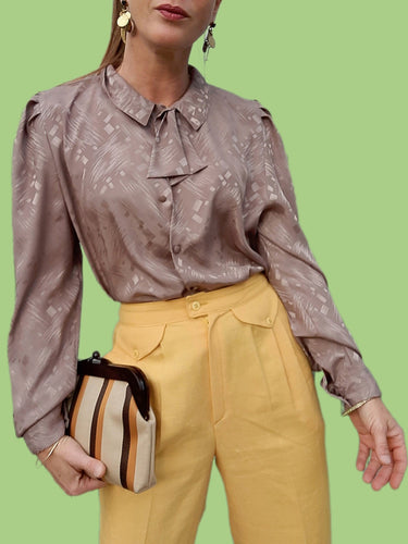 Chemisier vintage Claudia - Marron satiné. Taille L, 40, 42. Made in France.