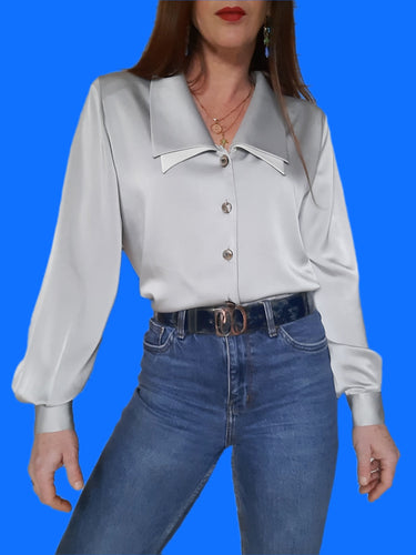 Chemisier vintage Carlita - Satin Gris à double col contrastant. Taille L, 40, 42. Marie Clémence. Made in France