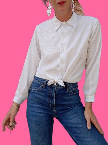 Chemisier vintage Davina - Blanc fleurie irisé. Taille S, 36, 38.
