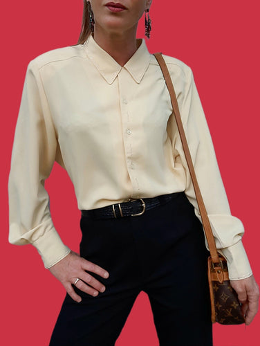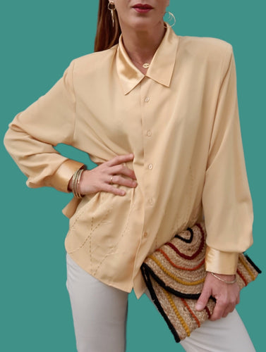 Chemisier vintage Marthe - Jaune à col et manches satinés. Taille XXL, 44, 46