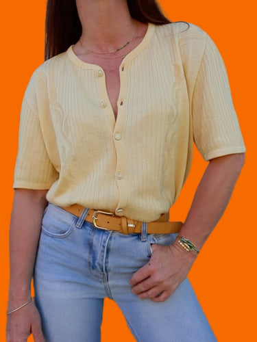 Gilet vintage Victoria - Jaune à motif feuillage. Taille XXL, 44, 46