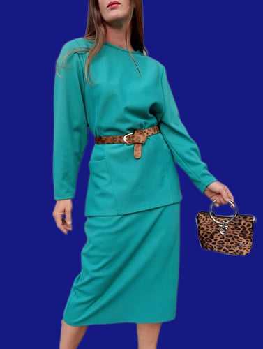 Ensemble vintage Luna - Pull et Jupe verts émeraude. Taille XXL, 44, 46