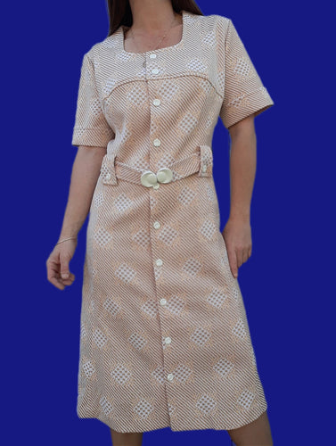 Robe vintage Stella - Imprimé damiers beige-moutarde. Taille XXL, 44, 46. Fabriqué en France.