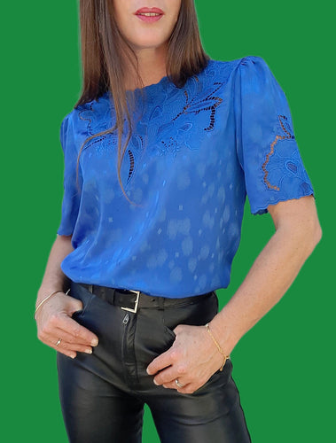 Top vintage Félicie - Bleu roi, broderies ajourées. Taille M, 38, 40.