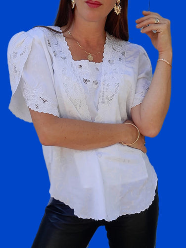 Blouse vintage Loéline - Broderies ajourées blanc irisé. Taille XL, 42, 44.