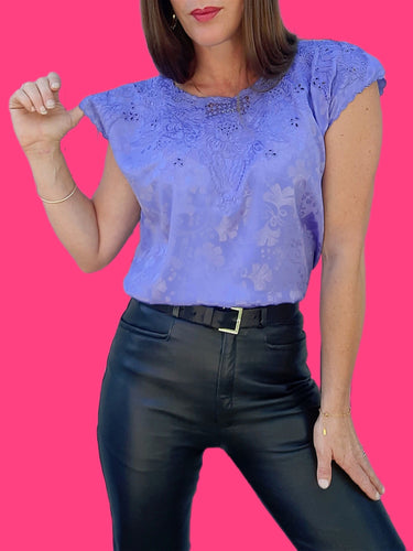 Top vintage Élga - Broderies ajourées et irisé parme. Taille S, 36, 38.