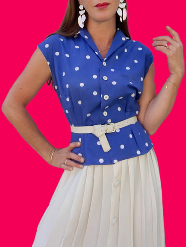 Top vintage Capucine - Bleu à pois blancs. Fronces à la taille. Taille S, 36, 38. PierBé