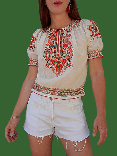 Blouse vintage Mila-Éva - Broderies florales Folk bohème oranges et vertes. Taille S, 36, 38