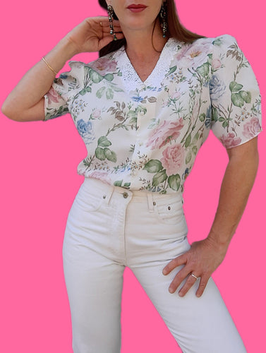 Chemisette vintage Johanna - Motif floral et col dentelle. Taille XL, 42, 44