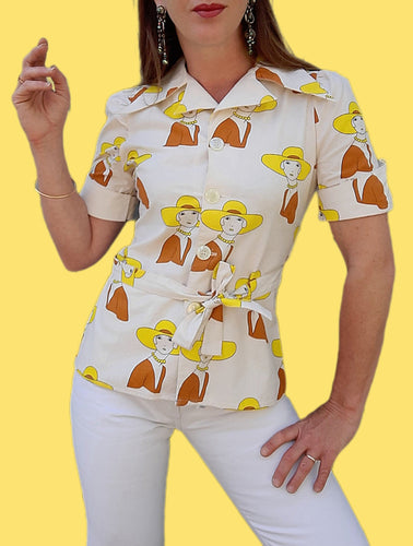 Chemisette vintage Irène - Type saharienne. Bonnes femmes jaune, beige et moutarde. Taille S, 36, 38. Made in France