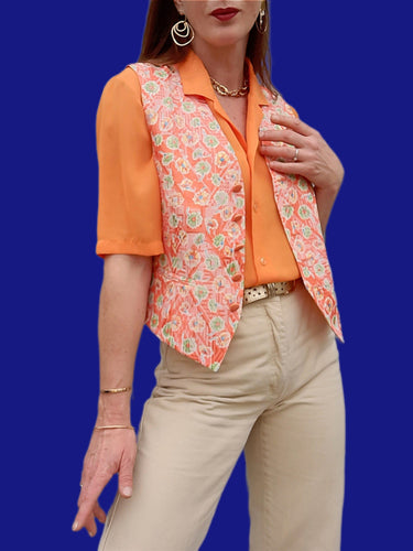 Chemisette et gilet vintage Claudy - Orange à fleurs. Taille L, 40, 42.Carole Richard. Made in France