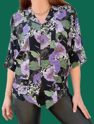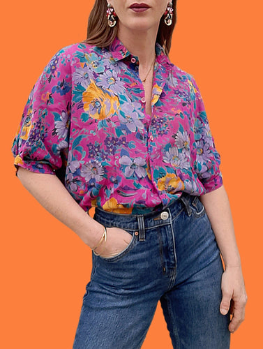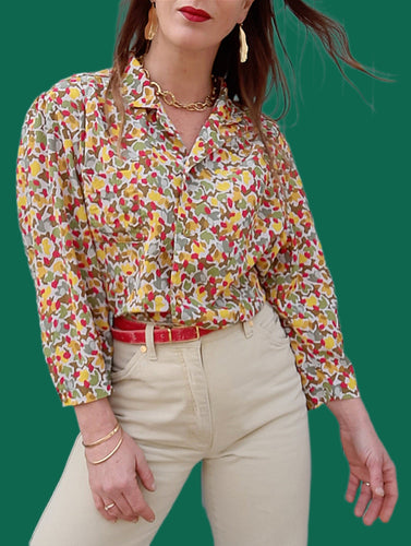 Chemisette vintage Zoé - Imprimé floral. Taille XL, 42, 44. Janine Pauporté. Made in France