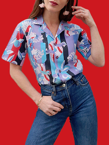Chemisette vintage Salima - Imprimé tropical. Perroquets. Taille S, 36, 38. Made in France