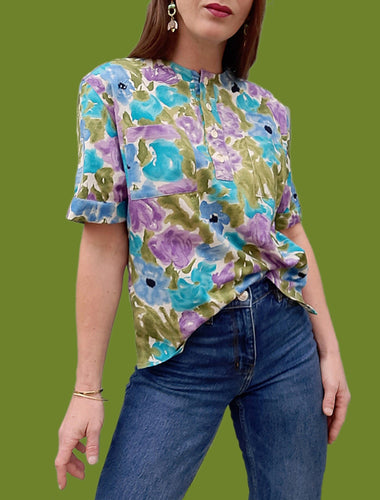 Tee-shirt boutonné vintage Clarisse - Imprimé floral. Taille M, 38, 40. Jean Dobré. Made in France