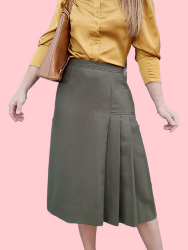 Jupe vintage Flavie - Plissée sur le côté. Pure laine kaki. Taille M, 38, 40. Made in France.