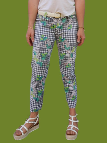 Pantalon vintage Paule - Carreaux vichy et imprimé floral. Taille M, 38, 40. Fabriqué en France