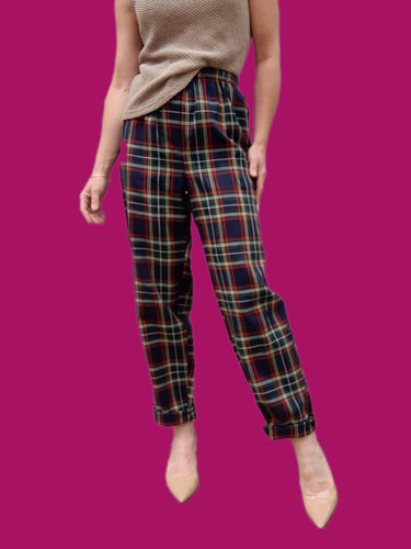 Pantalon vintage Nora - Tartan bleu marine. Taille L, 40, 42.