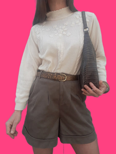 Pull vintage Cynthia - Broderies florales. Beige. Taille M, 36, 38, 40