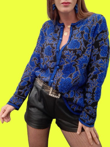 Cardigan vintage Lucille - Imprimé floral bleu, noir et doré. Taille L, 40, 42. Pierre Cardin. Made in Italy