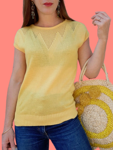 Pull d'été vintage Marcelle - Maille géométrique jaune. Taille M, 38, 40. Made in France.