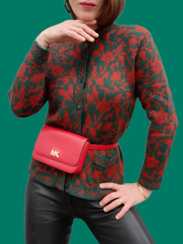 Cardigan vintage Nelly - Imprimé floral rouille et émeraude. Taille S, 36, 38. Sortilège.