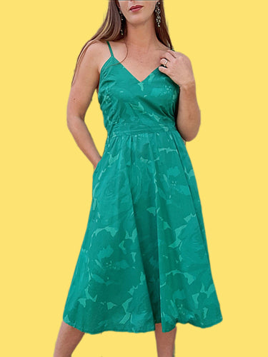 Robe vintage Carlotta - Imprimé floral vert. Dos nu, boutonnée sur l'arrière. Taille M, 38, 40