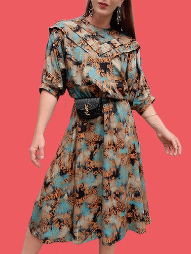 Robe vintage Gaëlle - Plastron volanté en V. Motif Aztèque. Taille M, 38, 40. Made in France