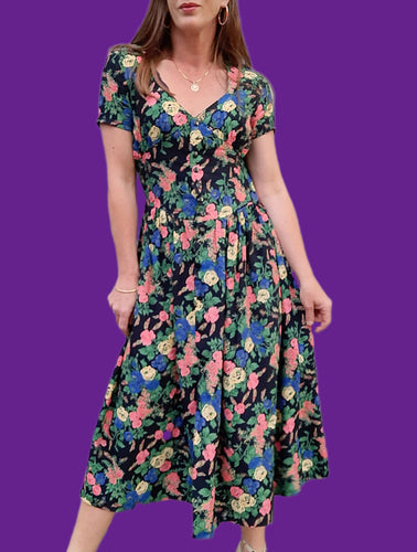 Robe vintage Erika - Toute boutonnée. Fleurie bleue marine. Taille M, 38, 40. Made in France.