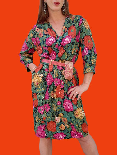 Robe vintage Sabine - Cache cœur fleuri orange, fuchsia et vert. Taille M, 38 40
