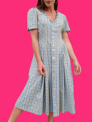 Robe vintage Odette - Toute boutonnée. Coton à carreaux bleu, verts et blancs. Dos lacé. Taille M, 38, 40.