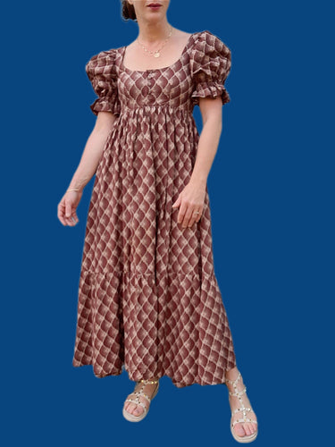 Robe longue vintage April - Manches à volants. Imprimé floral marron et beige. Taille XS, 34, 36.