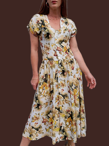 Robe vintage Marie - Fleurie kaki et jaune. Toute boutonnée. Taille M, 38, 40.