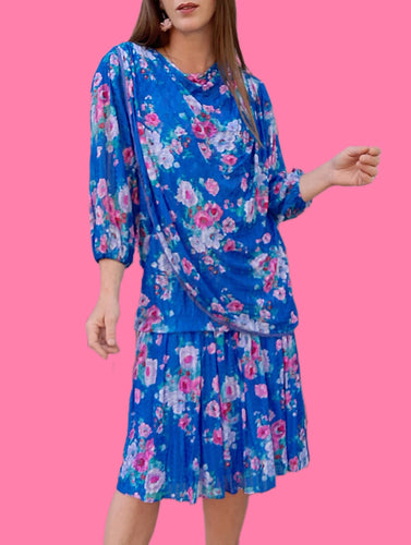 Robe vintage Dolly - Basque à effet de superposition. Jupe plissée bleue roi. Taille M, 38, 40.