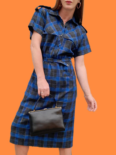 Robe vintage Loucia - Type saharienne bleue a carreaux multicolores. M, 38, 40