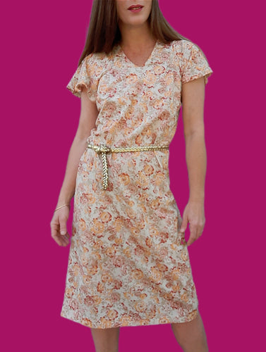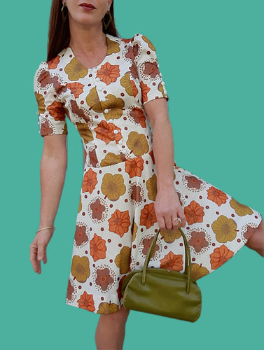 Robe vintage Azilis - Fleurs kakis et oranges. Taille S, 36, 38. Pleiae. Made in France