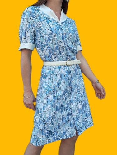 Robe vintage Marjorie - Imprimé abstrait bleu. Taille S, 36, 38. Fabriqué en France