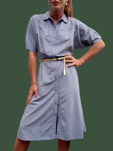 Robe chemise vintage Liliane - Bleu glacier, boutonnée. Taille L, 40, 42. Jean Bailly. Made in France.