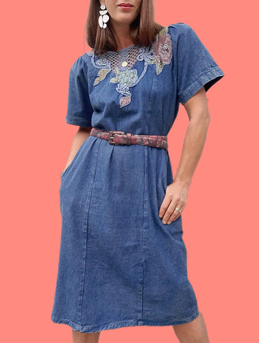 Robe vintage Océane - Broderies florales ajourées. En denim. Taille XL, 42, 44. Marilu. Made in Italy.