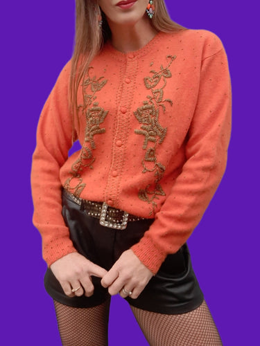 Cardigan "Seconde" Victoria - Laine & Angora orange à perles bronzes. Taille M, 38, 40. Alain Manoukian.