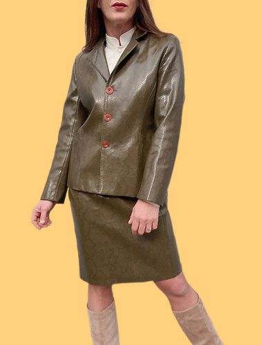 Ensemble vintage Anaë - Blazer & jupe crayon façon peau de serpent kaki. Taille M, 38, 40