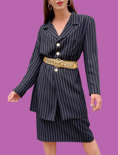 Ensemble vintage Yolaine - Veste et jupe crayon grise à rayures. Taille S, 36, 38. Made in France