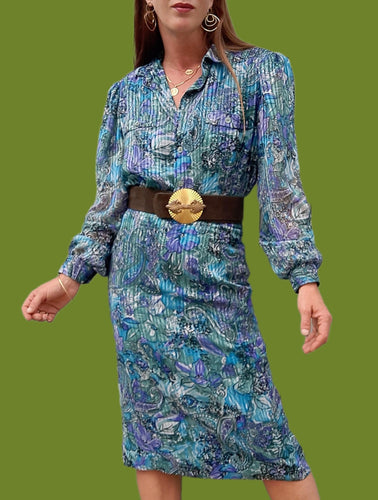 Ensemble vintage Jenny - Blouse et jupe motif cachemire vert & bleu pétrole. Taille M, 38, 40. Markwald