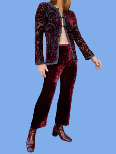 Ensemble vintage Debby - Veste et pantalon en soie moirée bordeaux. Taille XS, 34, 36