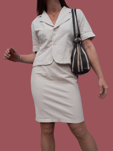 Ensemble vintage Mendy - Veste & jupe crayon en lin fleuries. Taille S, 36, 48. Fabriqué en France