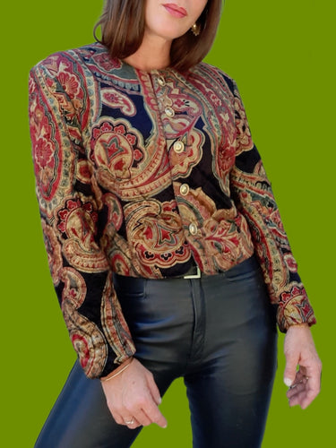 Boléro vintage Anouck - Panne de velours Paisley. Kaki, doré, bordeaux. Taille M, 38, 40