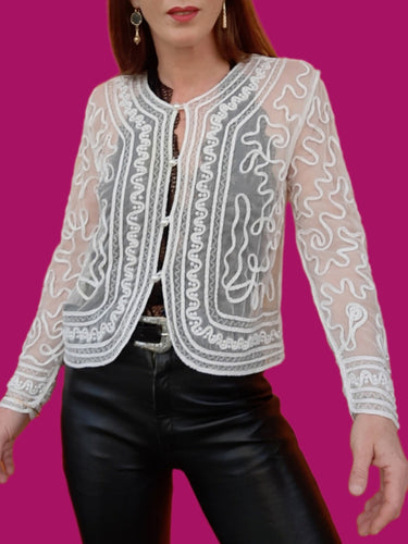 Boléro vintage Constance - Voile transparent orné de perles et de broderies. Taille M, 38, 40